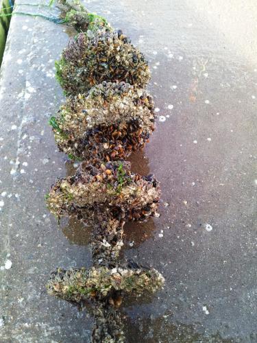 På detta rack (Rack 1), utplacerad i maj 2013, på yttre flytbryggan vid Aspholmen (nära Saltholmen i Göteborg) växte det nästan bara blåmusslor och på några av skivorna också havstulpaner. På närhängande rack (0,5 resp 1 meters avstånd) var det betydligt färre blåmusslor.
