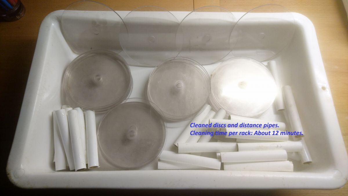Alternative, if you are in a hurry, place the discs and pipes in 10 % caustic soda and wait over night. Use dish gloves and safety glasses!