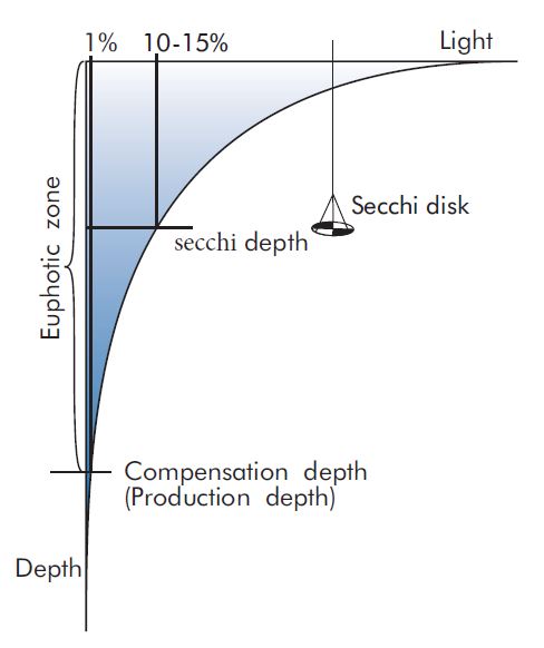The secchi depth (visual depth) depends on how deep sunlight can penetrate the water. A shallow secchi depth means that the penetrating light is greatly absorbed or effectively spread. The secchi depth is a measure of the water's content of particles. Secchi depth is measured in metres with a Secchi disc (for more information and figures, see the pdf version). The biological primary production in the ocean can occur down to the depth where about one percent of the light in the surface remains (compensation depth). In the open ocean this can be as deep as 200 metres. In coastal areas the secchi depth will often give a good estimate of the biomass of phytoplankton. There is, however, no direct correlation between secchi depth and phytoplanktonic biomass in areas with high concentrations of yellowing matter, such as in the Gulf of Bothnia. The secchi depth in the open Baltic sea can be up to 25 metres. It is significantly less near the coasts. On the Swedish west coast, it varies from 0.5 to 10 metres. The secchi depth in the open sea is more than 50 metres.