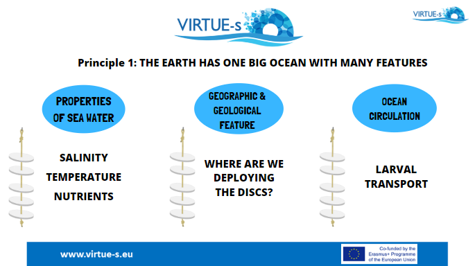 Teachers can introduce the properties of seawater, as well as explaining geographical and geological concepts about the location where students are deploying the VIRTUE discs. Youngsters can be asked to take measurement of physical and chemical properties (such as salinity, temperature, pH, nutrients content...) of seawater while deploying or retrieving the discs. Students can understand how these properties affect the distribution of species in the ocean.