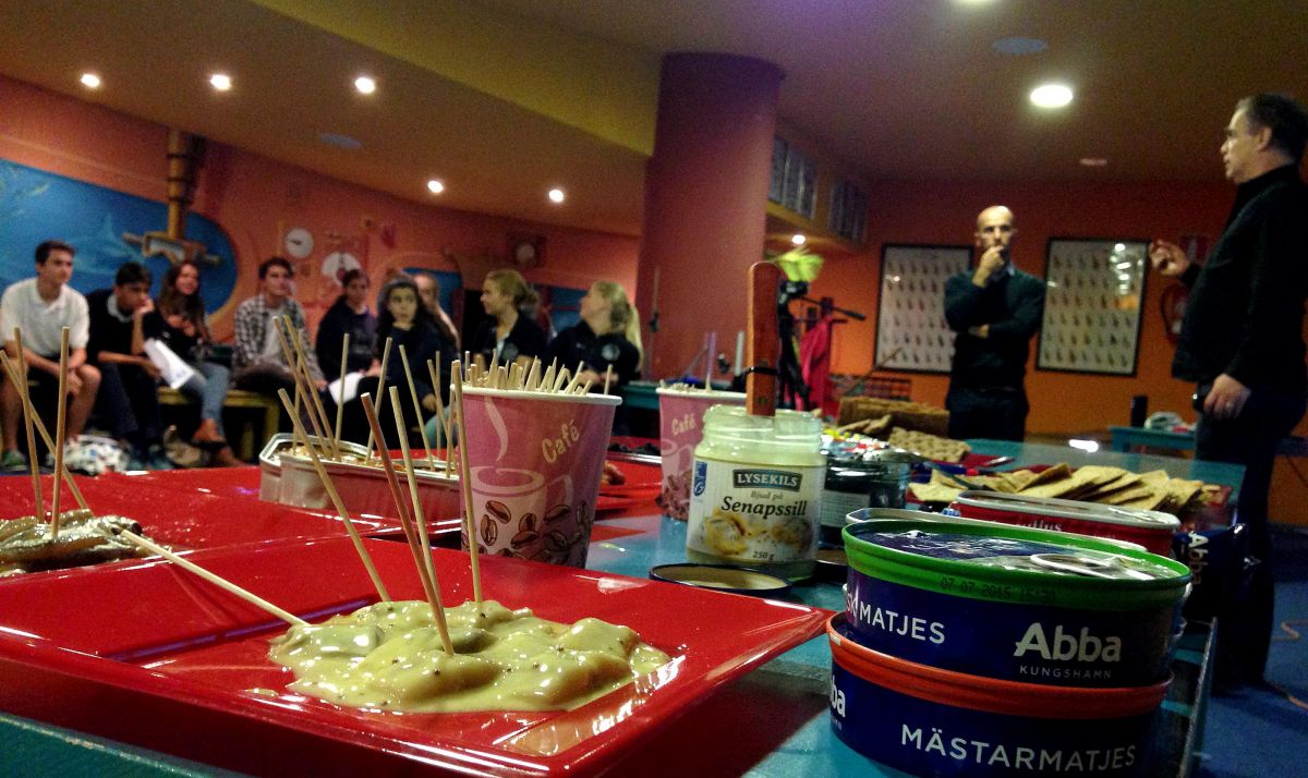 Även den här gången hade vi en videokonferens. Dock fungerade inte tekniken optimalt, vilket försvårade kommunikationen med skolan i Sverige. Men, men, skam den som ger sig. Mot slutet blev det bättre. Dagen på Akvariet avslutades med ännu ett matprovningsevent. Vi dukade upp med svensk mat från havet (Kalles kaviar, tångknäcke, etc) och spansk mat, i form av tapas från havet (torsk, lax, friterade torskbollar, etc). Studenterna åt med god aptit och som tack för maten (som sponsrades av EU-projektet Sea for Society) fyllde studenterna i en enkät med havsrelaterade frågor. Efter maten åkte alla studenterna till T/S Gunilla, som ligger förtöjd centralt i Palmas hamn, för en guidad rundtur och fika.